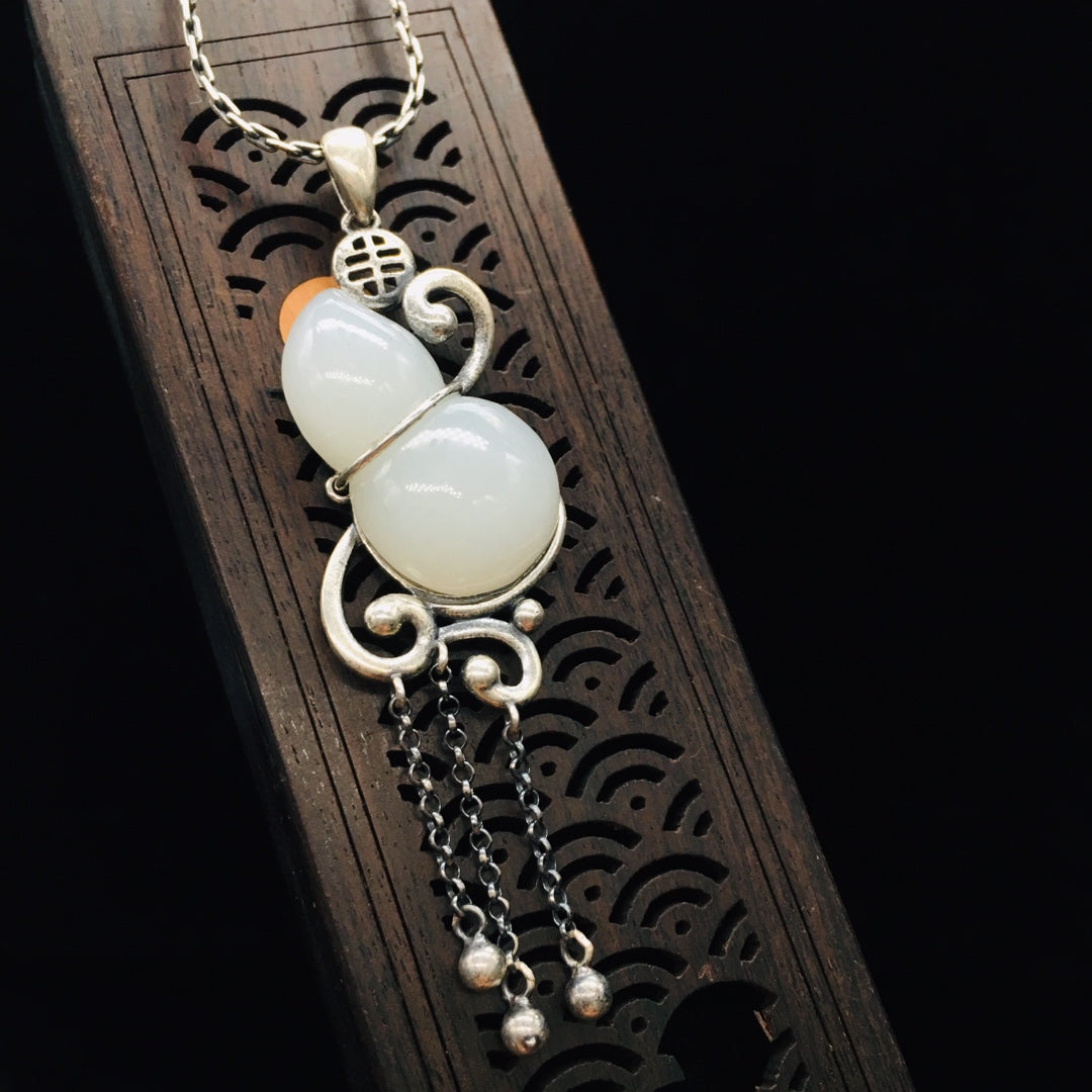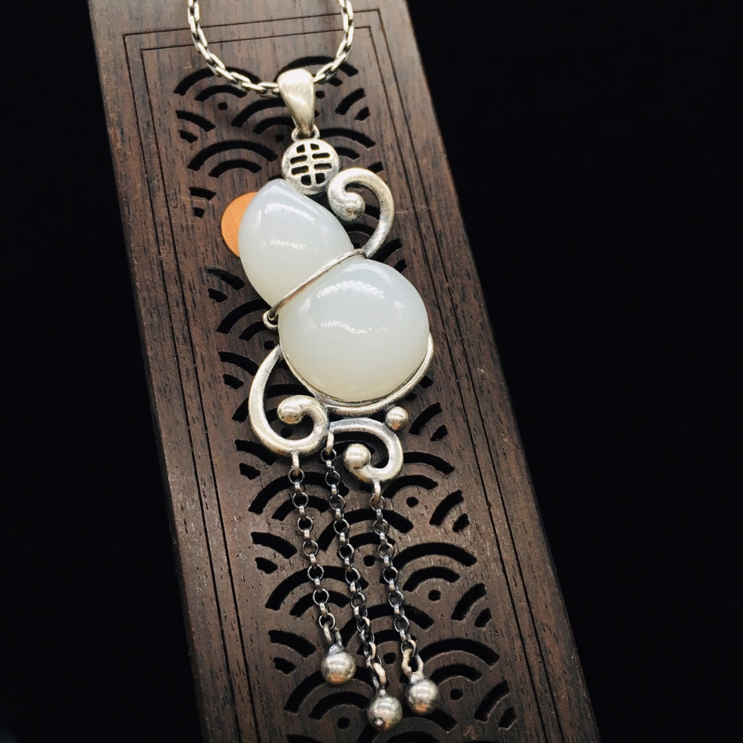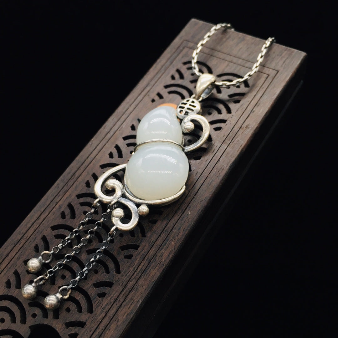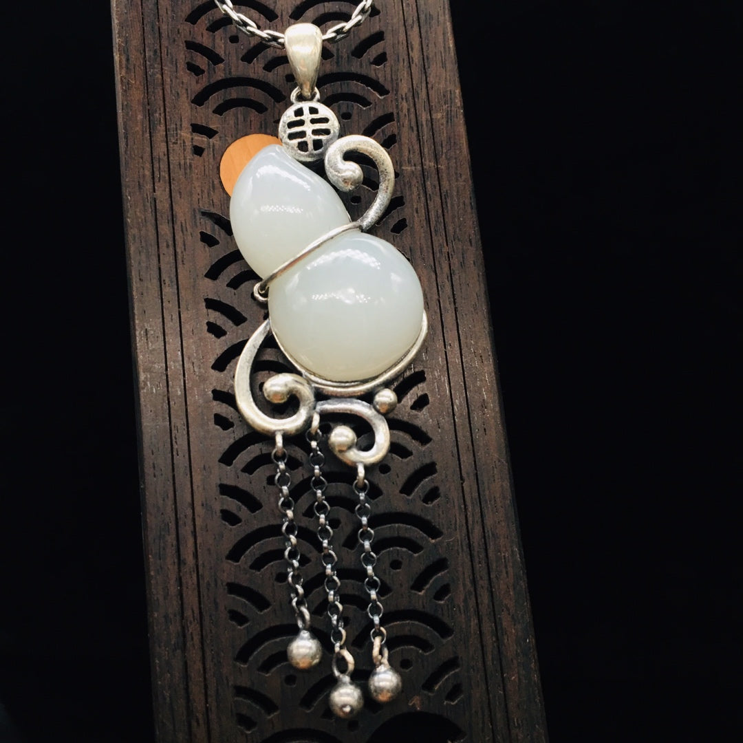 Silver-plated Hetian jade vintage gourd pendant, jade size: 15mmx23mm    银和田玉复古葫芦吊坠