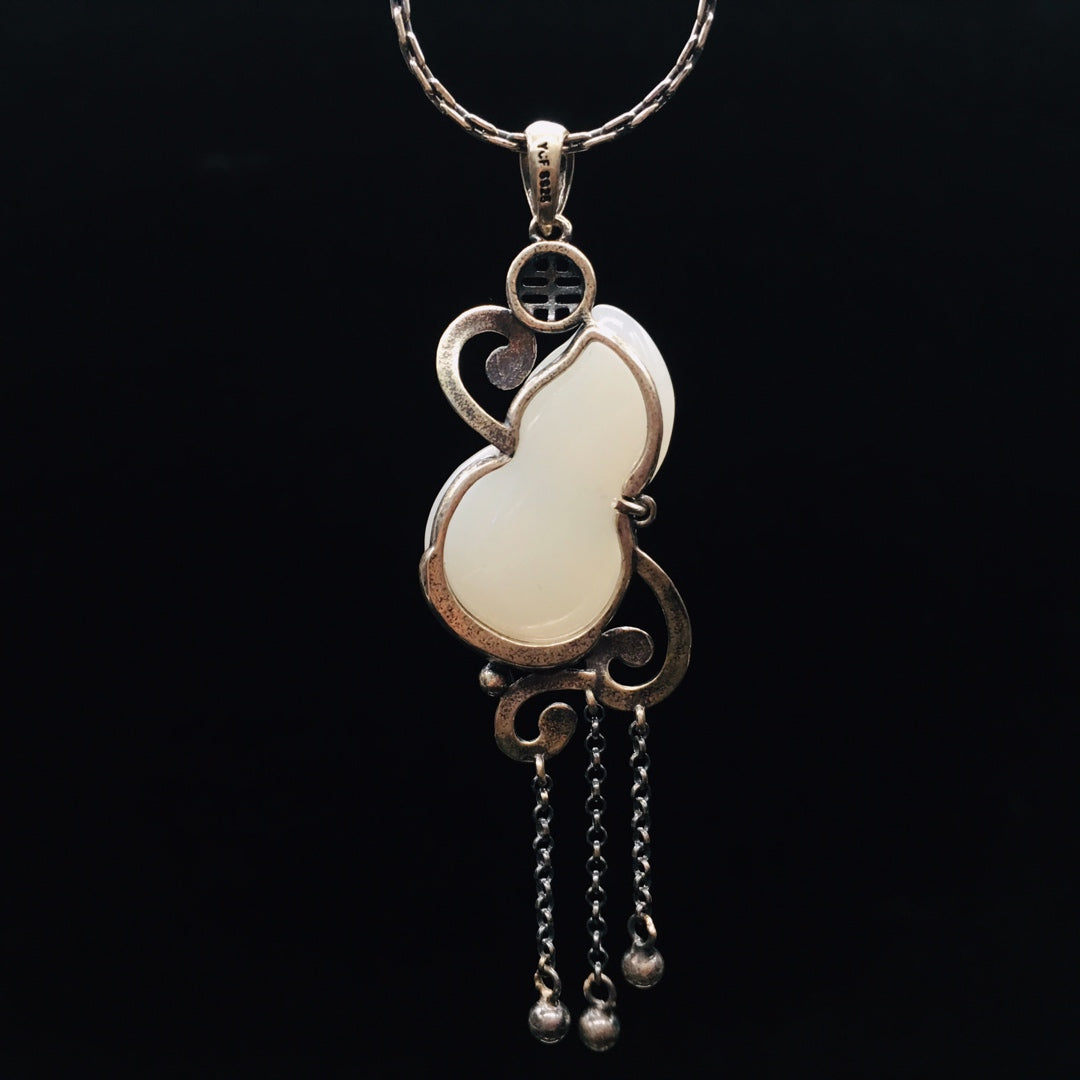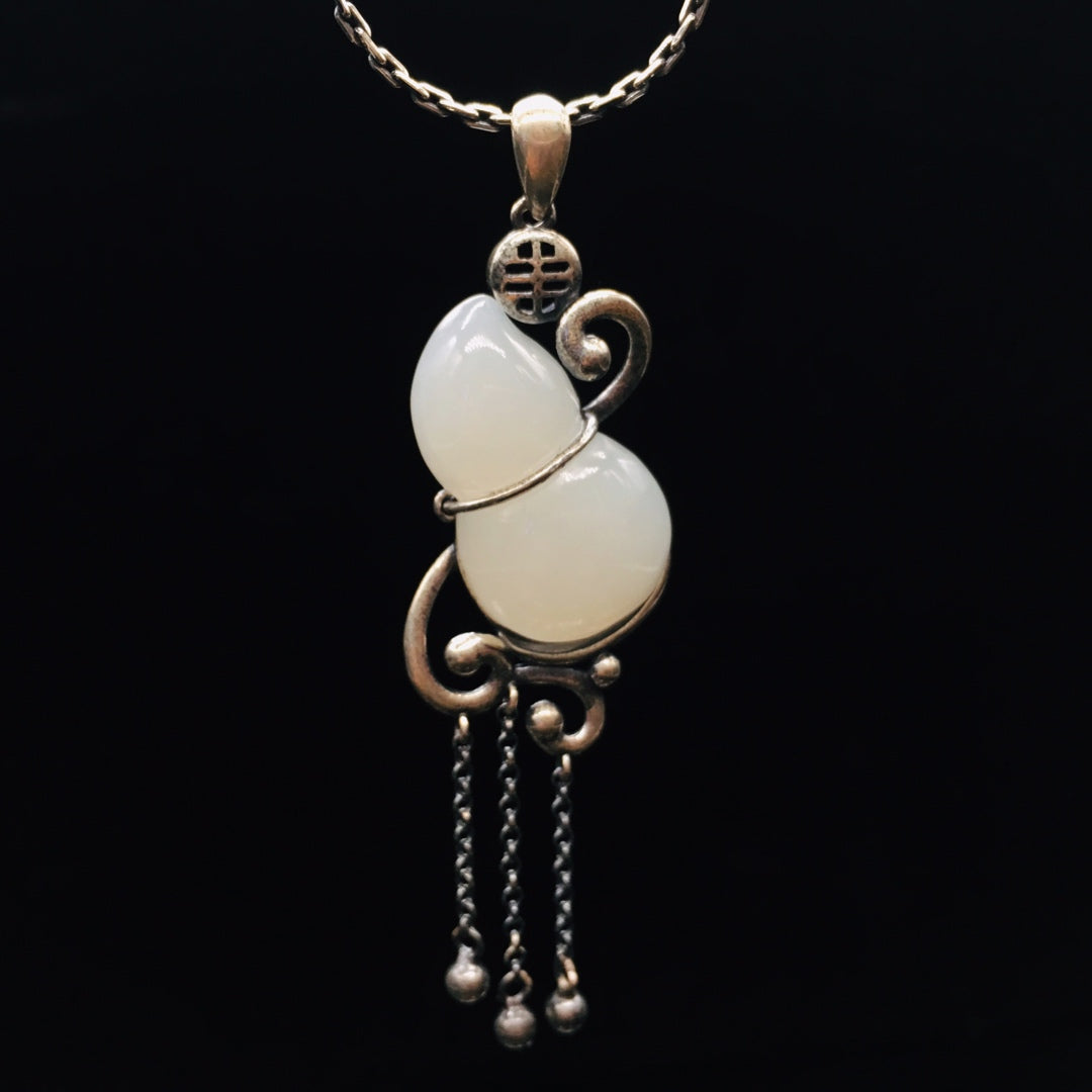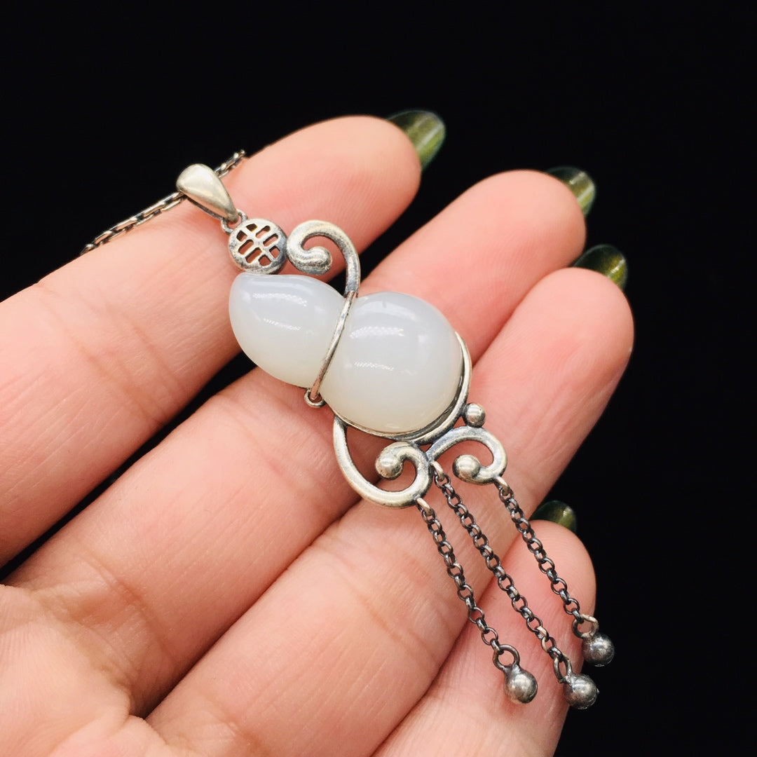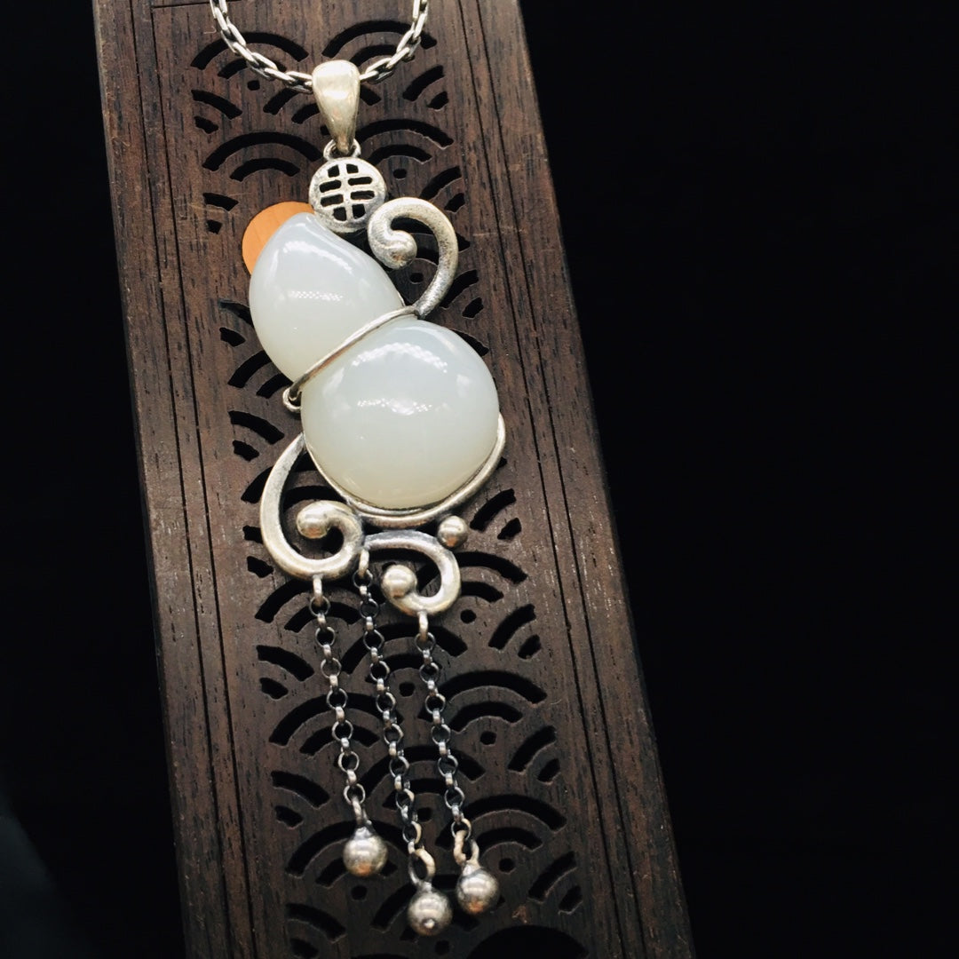 Silver-plated Hetian jade vintage gourd pendant, jade size: 15mmx23mm    银和田玉复古葫芦吊坠