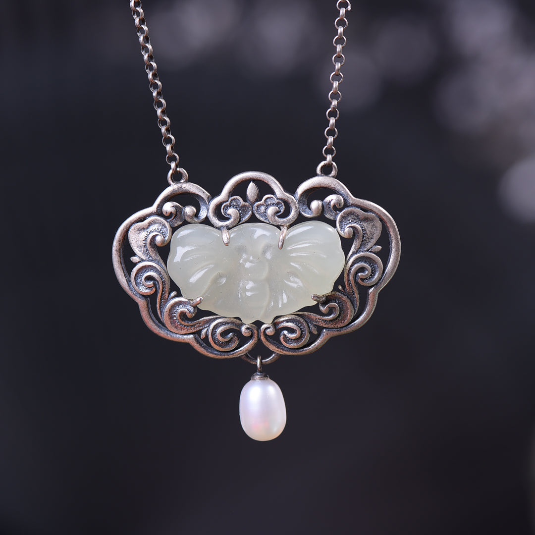 Silver-plated Hetian jade butterfly chain pendant, jade size: 15mmx26mm    银镶和田玉蝴蝶自生链吊坠