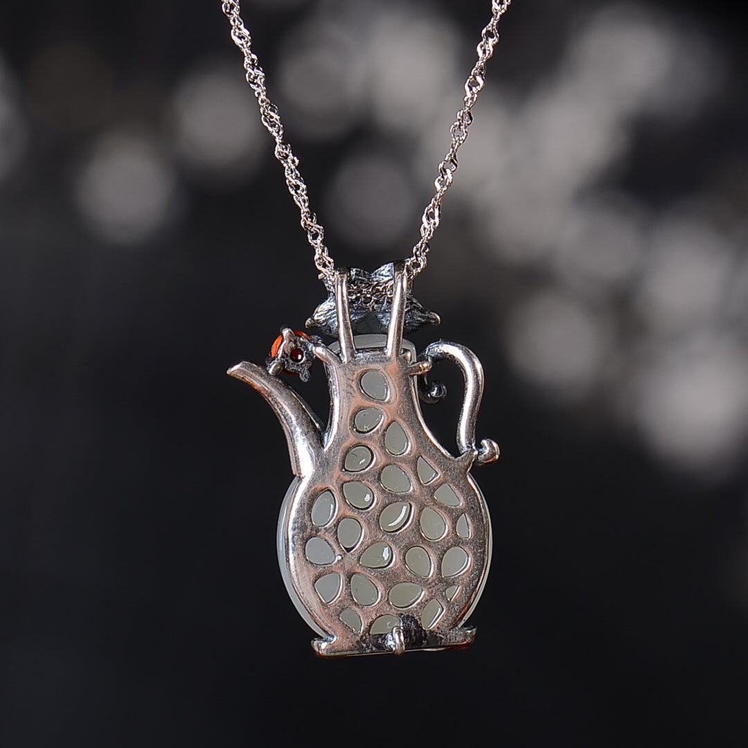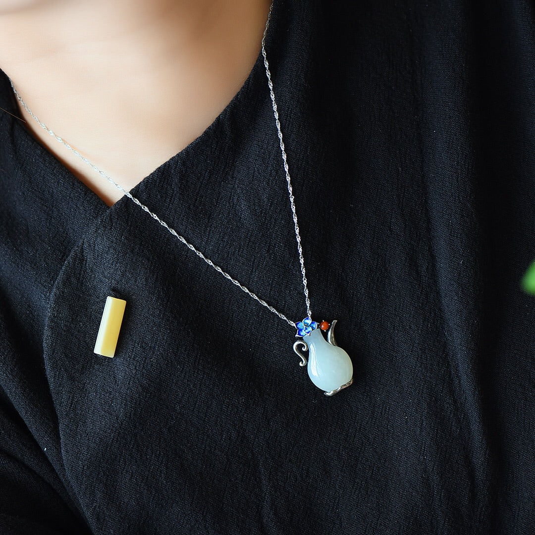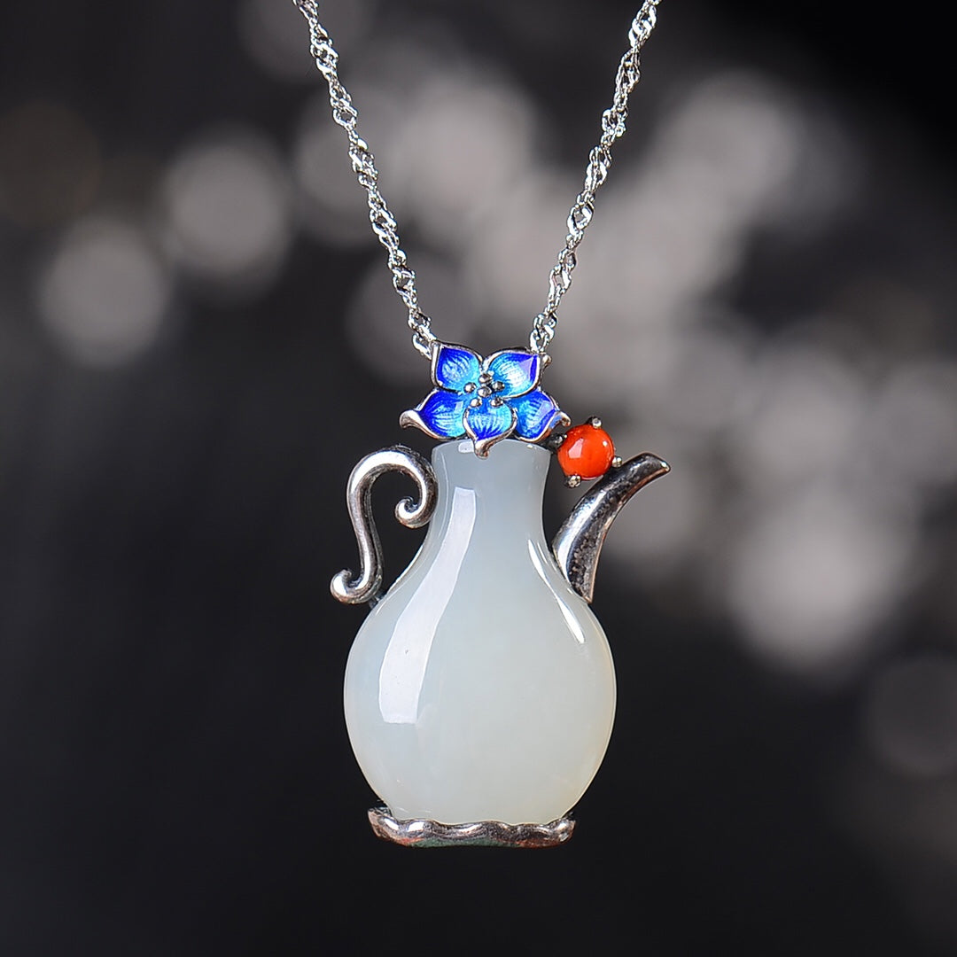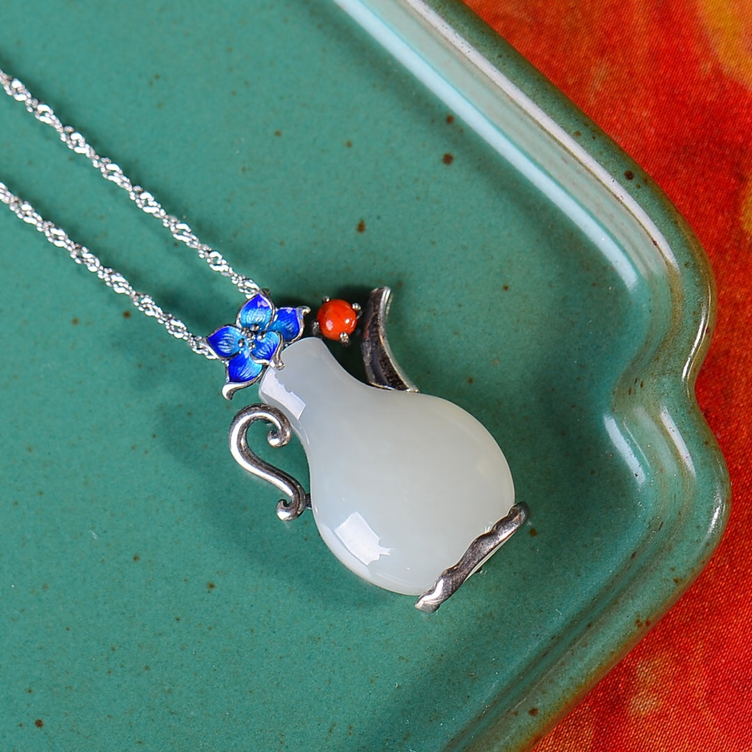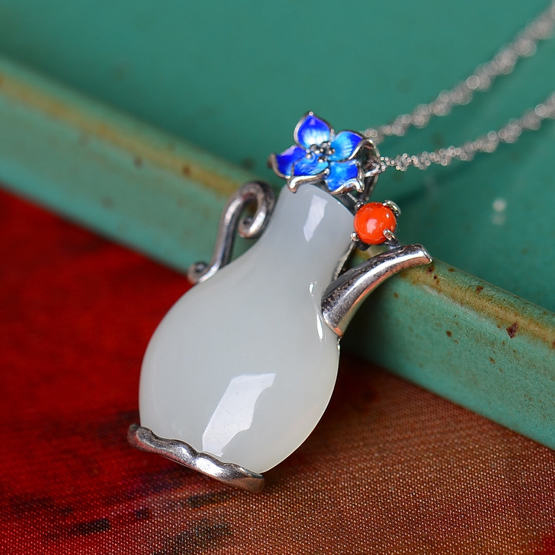 Silver-plated Hetian jade vintage enamel vase pendant, jade size: 16mmx23mm   银和田玉复古珐琅花瓶吊坠