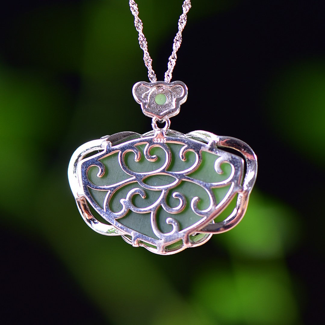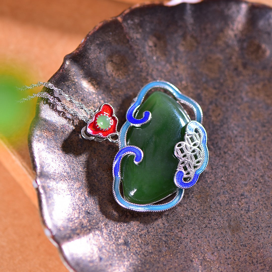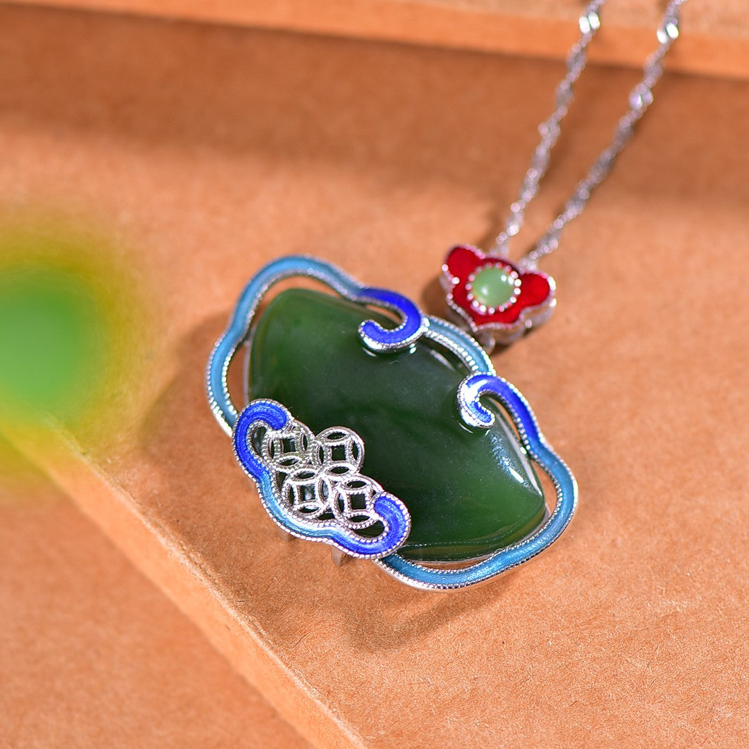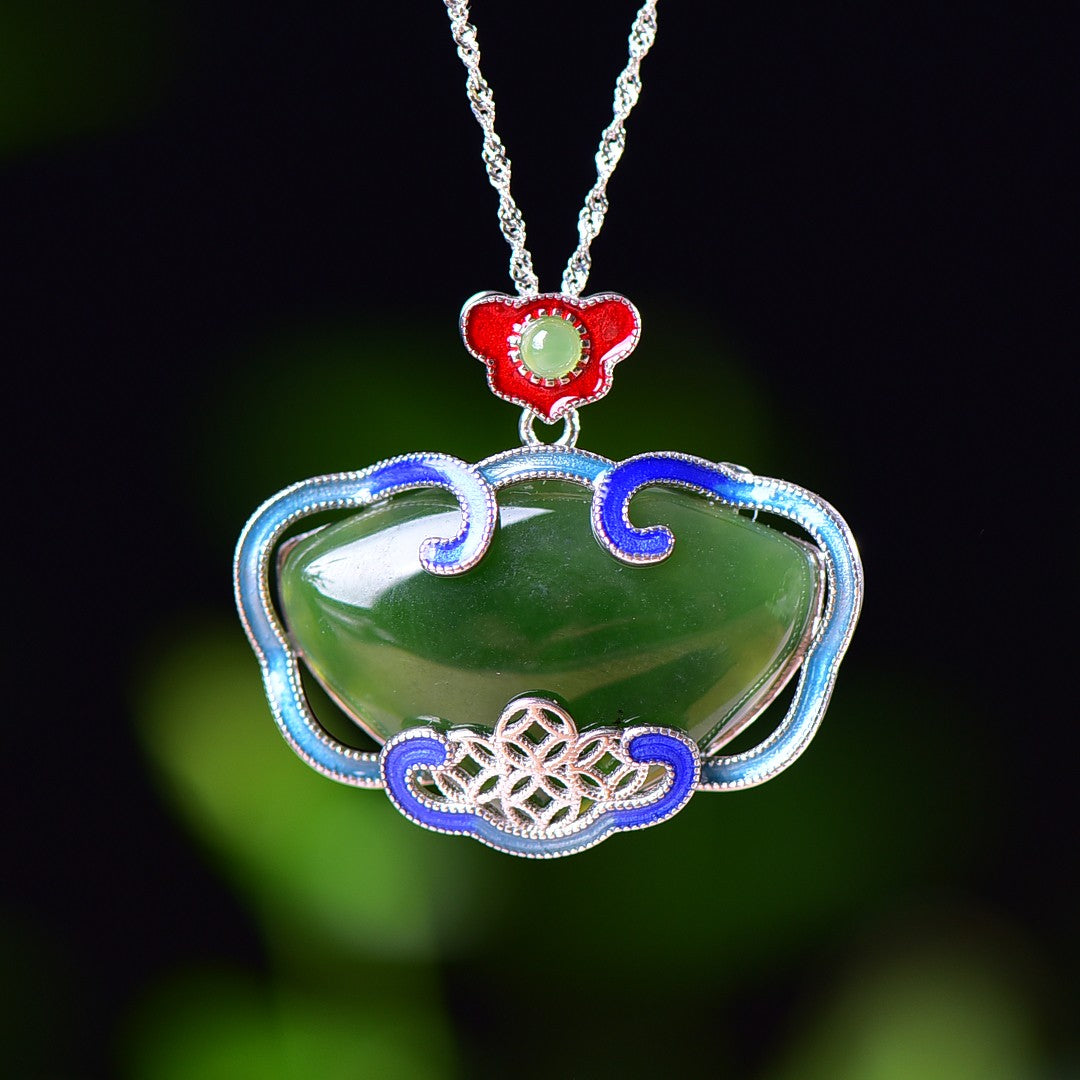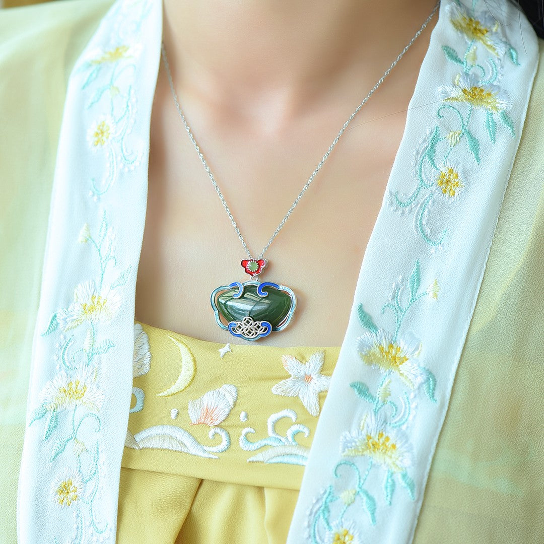 Silver inlaid Hetian jade jasper special-shaped enamel Ruyi lock pendant, jade size: 20mmx30mm     银镶和田玉碧玉异形珐琅如意锁吊坠