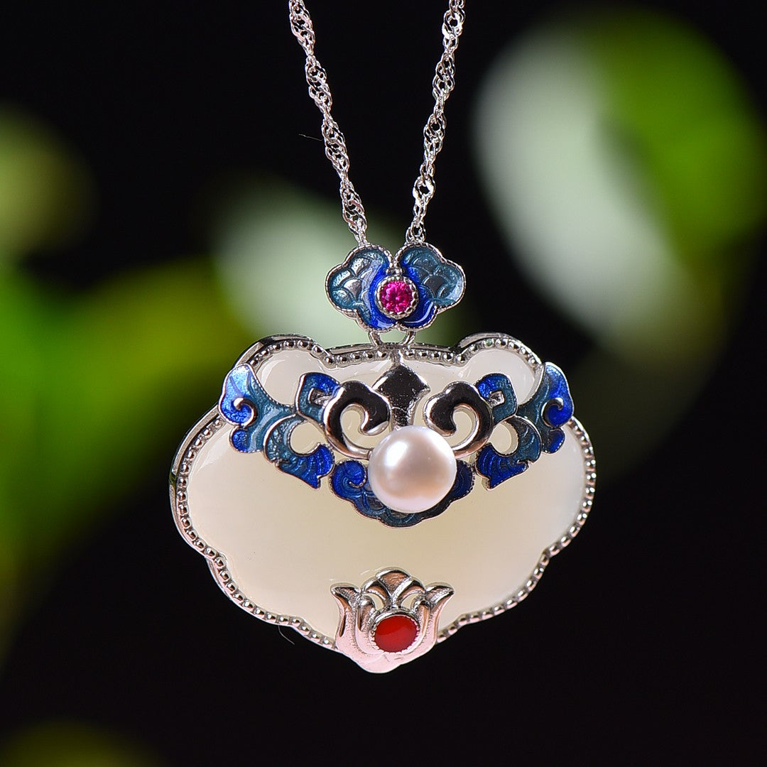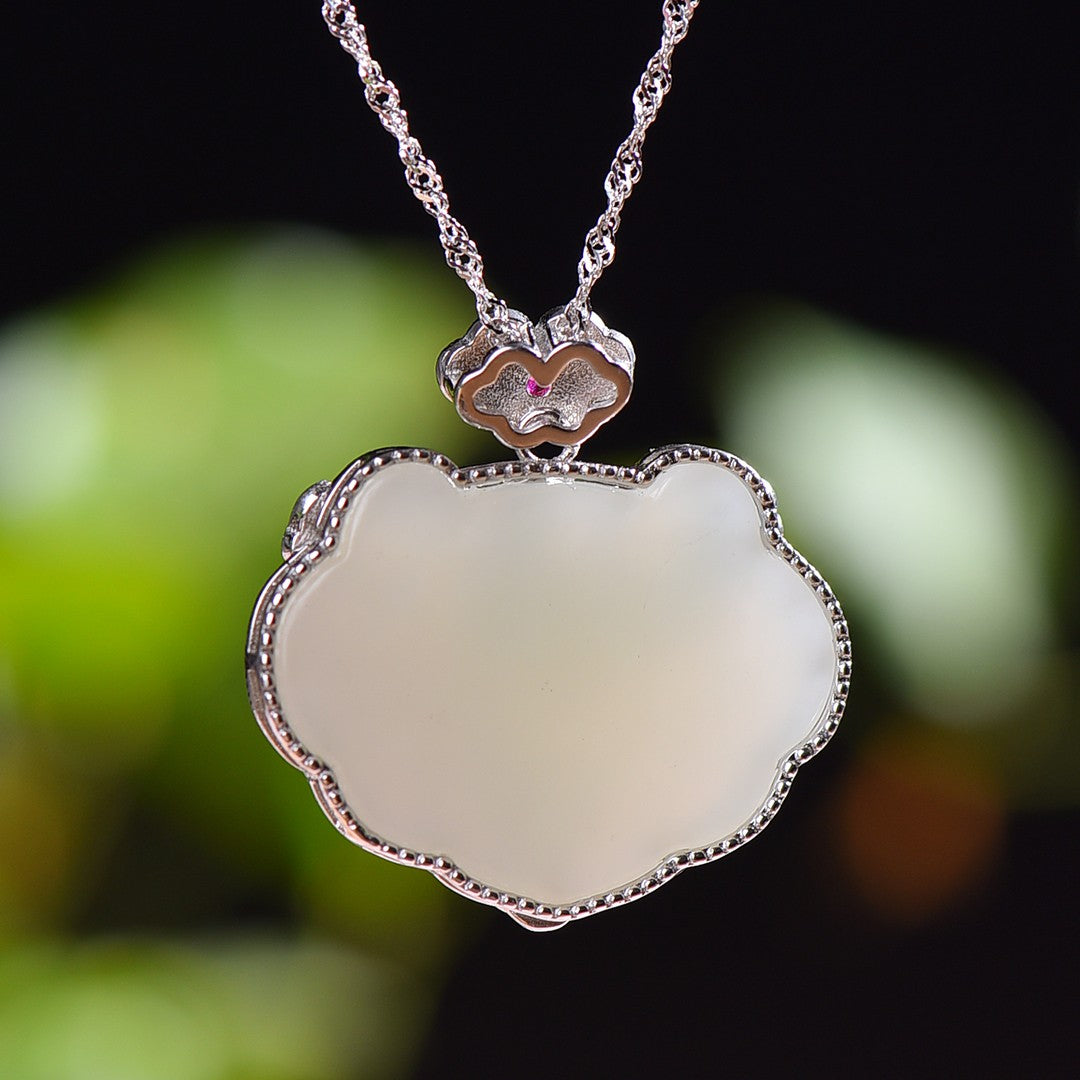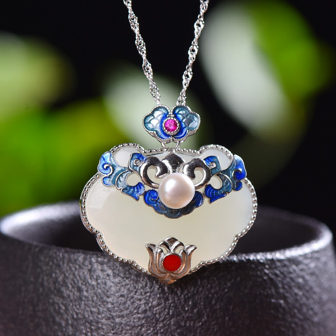 Silver-plated Hetian jade Ruyi lock enamel pendant, jade size: 10mmx12mm    银镶嵌和田玉如意锁珐琅吊坠