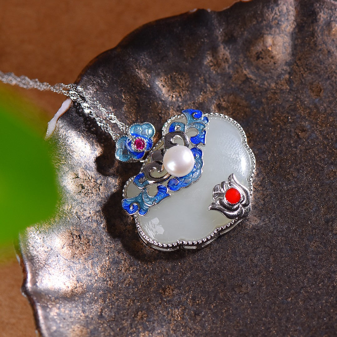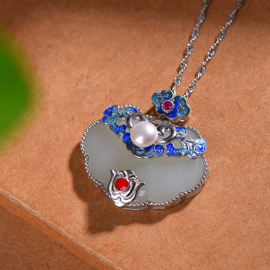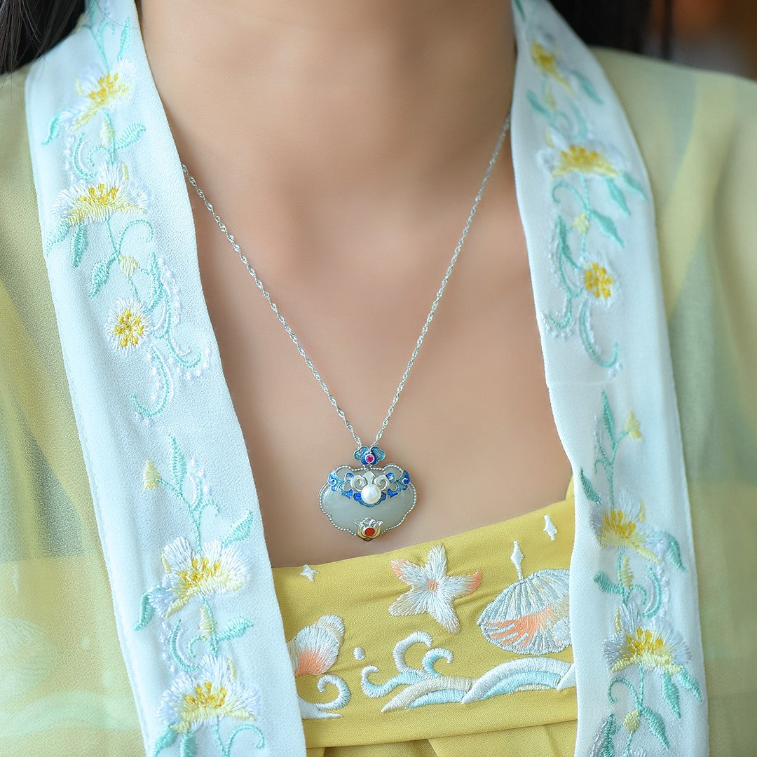 Silver-plated Hetian jade Ruyi lock enamel pendant, jade size: 10mmx12mm    银镶嵌和田玉如意锁珐琅吊坠