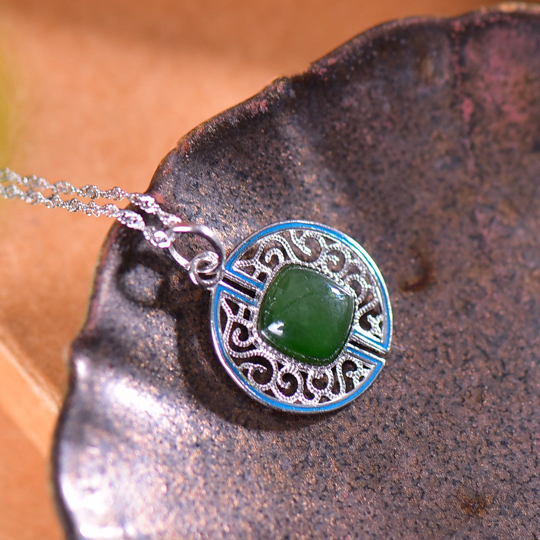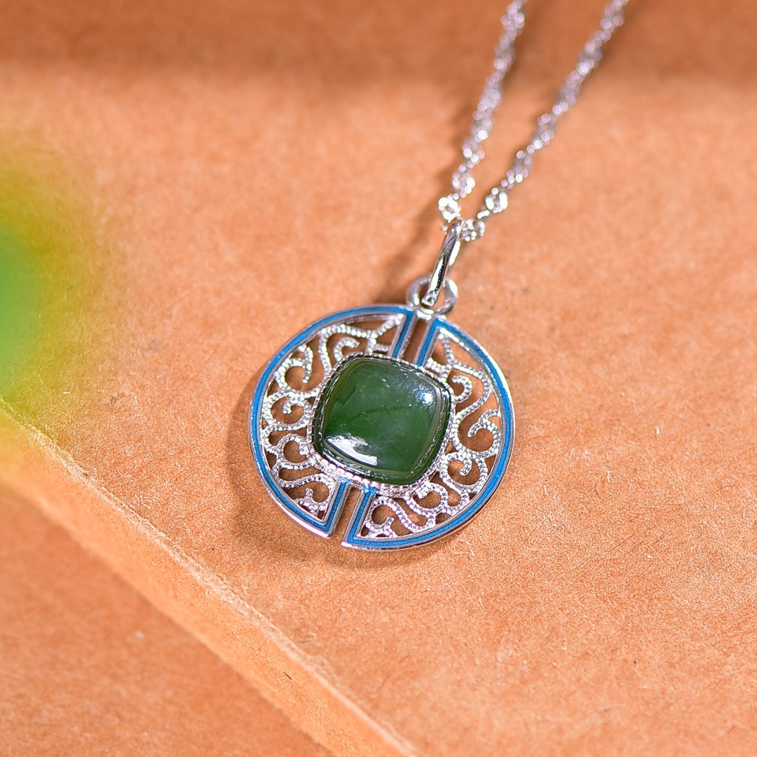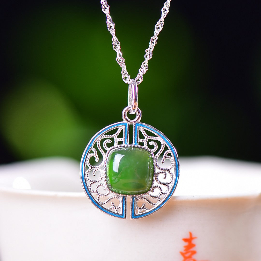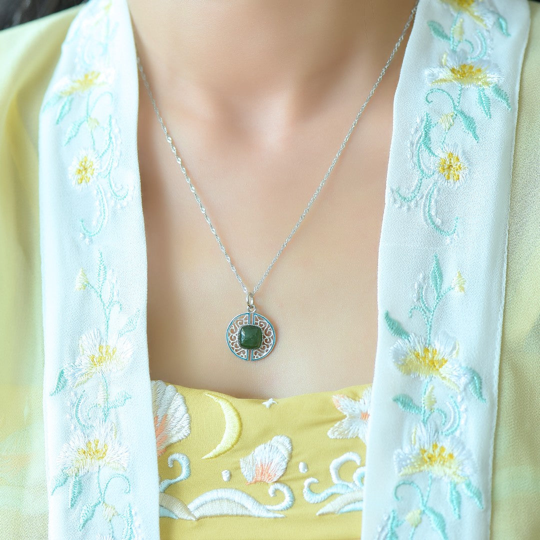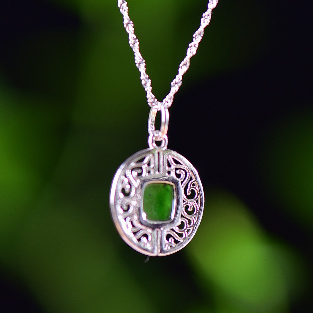 Silver inlaid Hetian jade jasper square drum face plain silver pendant, jade size: 8mmx8mm    银镶和田玉碧玉方形鼓面素银吊坠