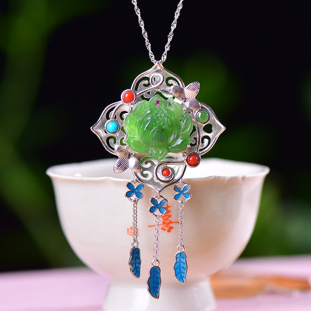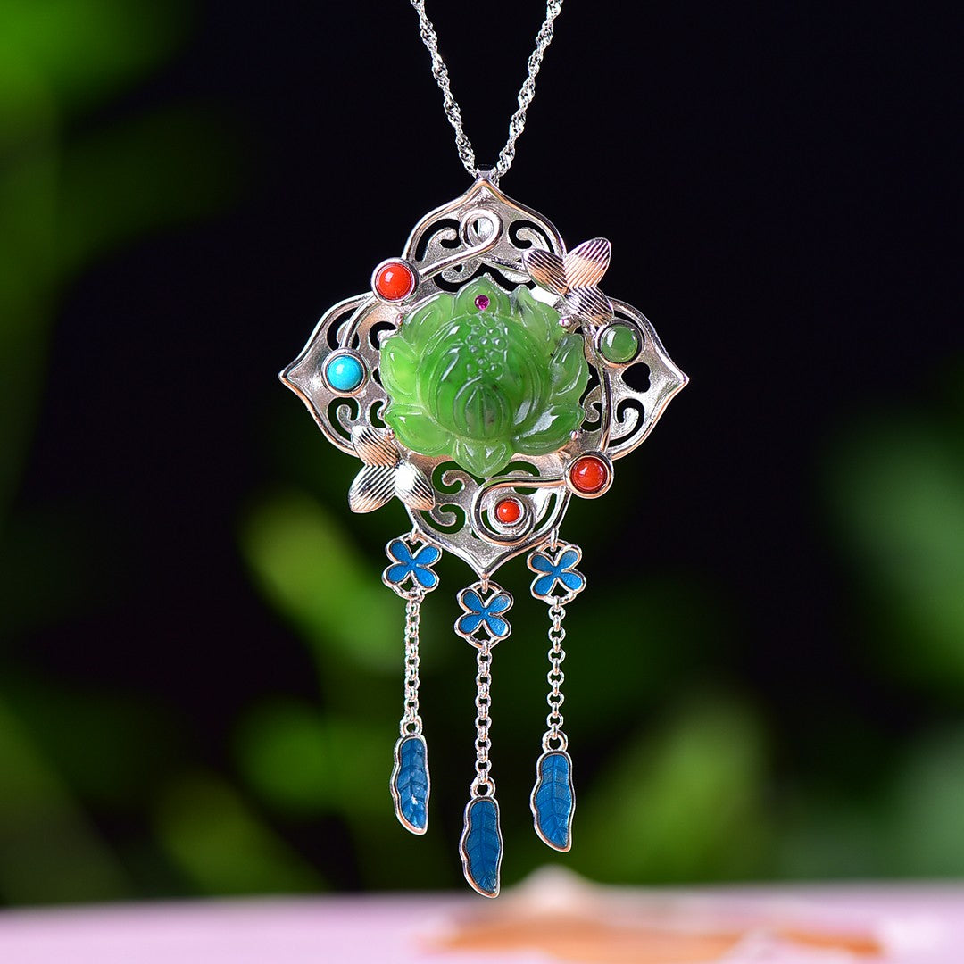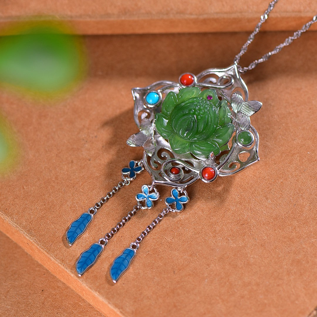 Silver gold plated Hetian jade jasper lotus enamel with multi-treasure tassel pendant, jade size: 20mmx21mm       银镀金镶和田玉碧玉莲花珐琅配多宝流苏吊坠