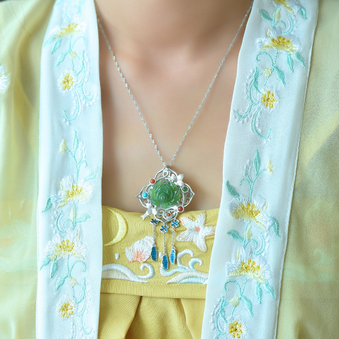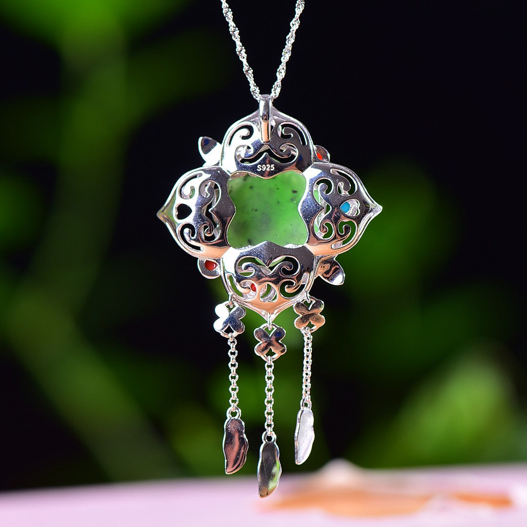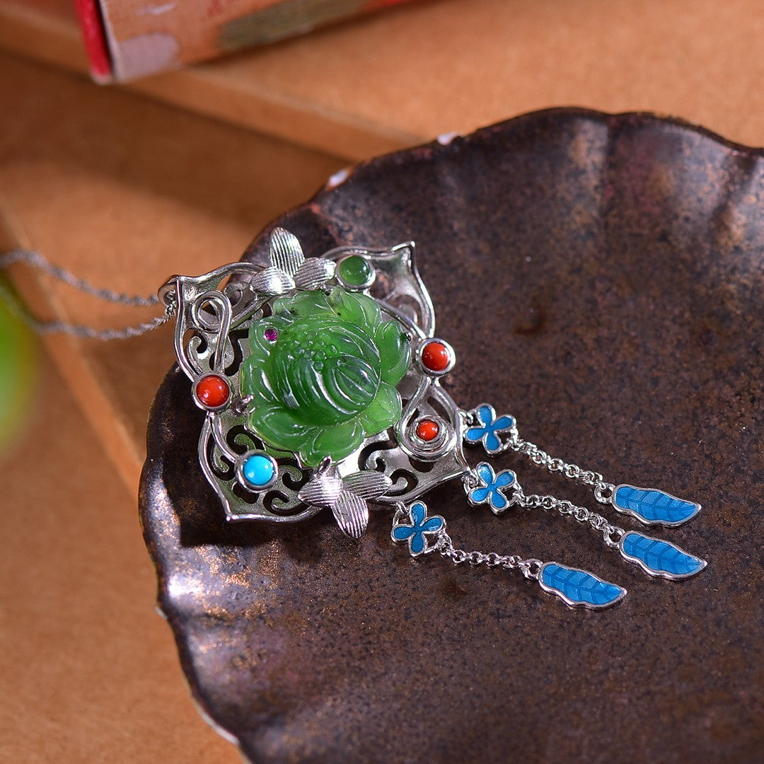 Silver gold plated Hetian jade jasper lotus enamel with multi-treasure tassel pendant, jade size: 20mmx21mm       银镀金镶和田玉碧玉莲花珐琅配多宝流苏吊坠