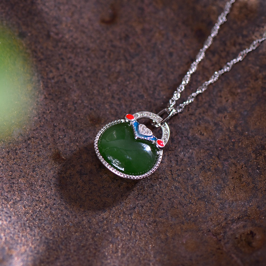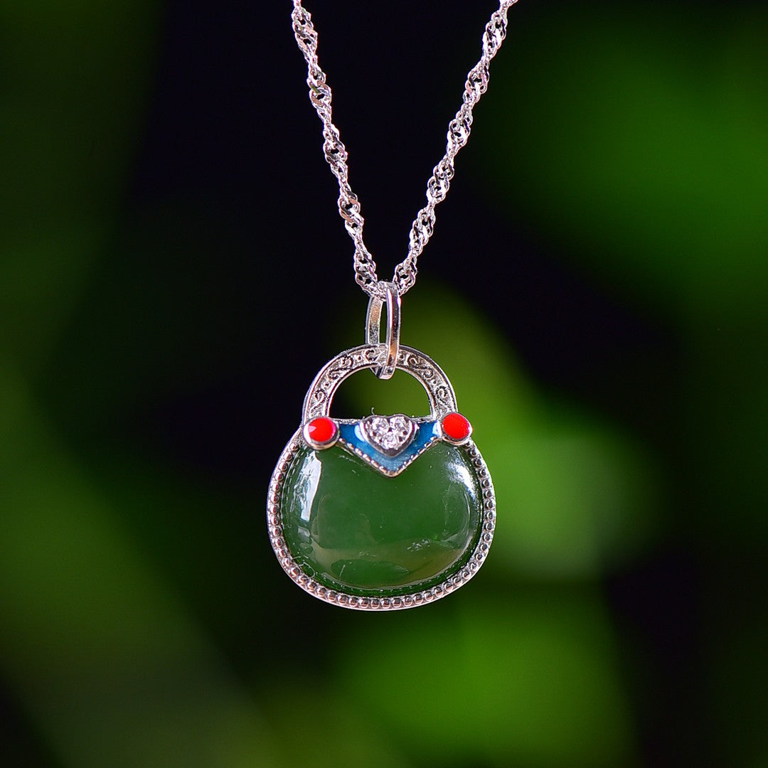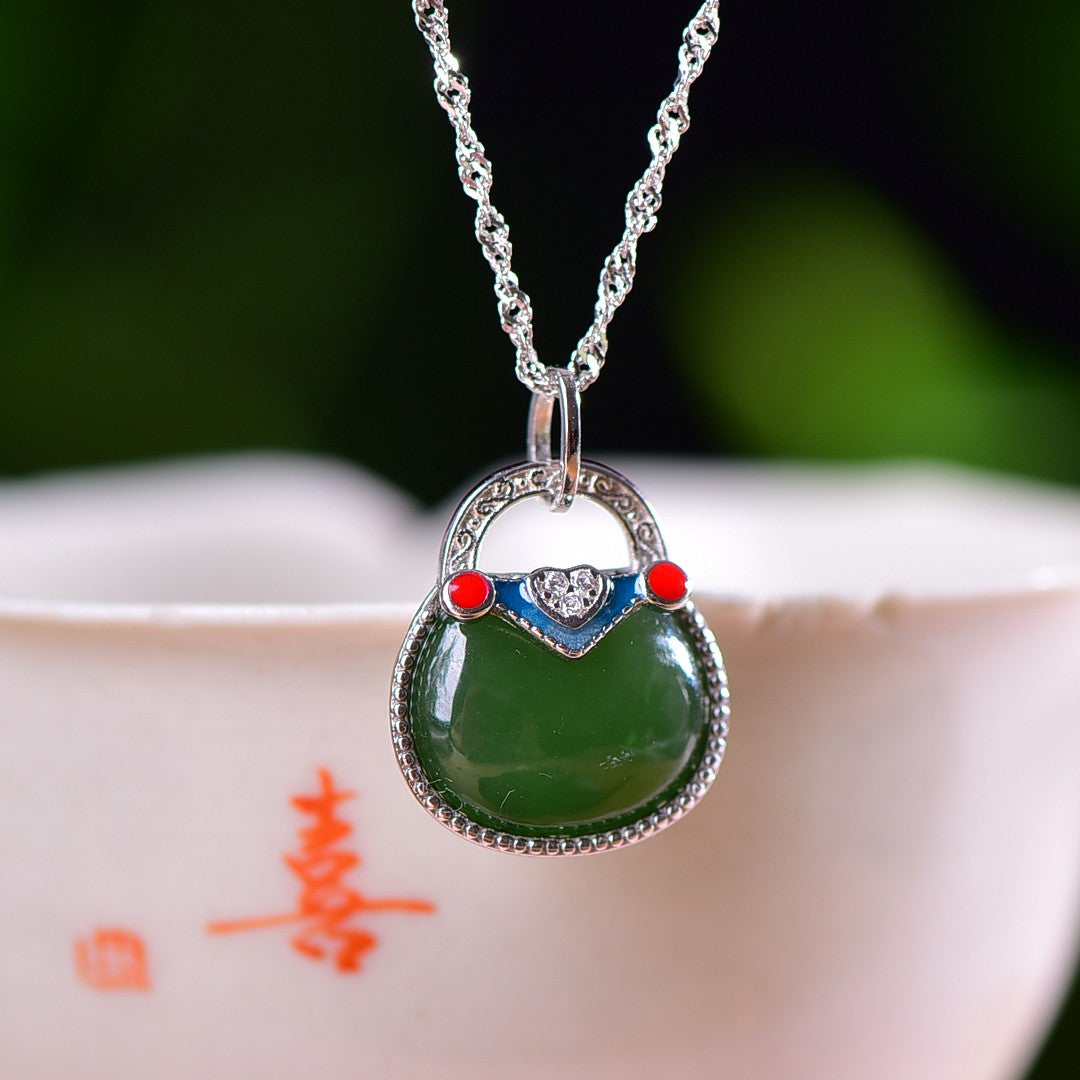 Silver gold plated Hetian jade jasper egg bread enamel pendant, jade size: 10mmx12mm     银镀金镶和田玉碧玉蛋面包包珐琅吊坠