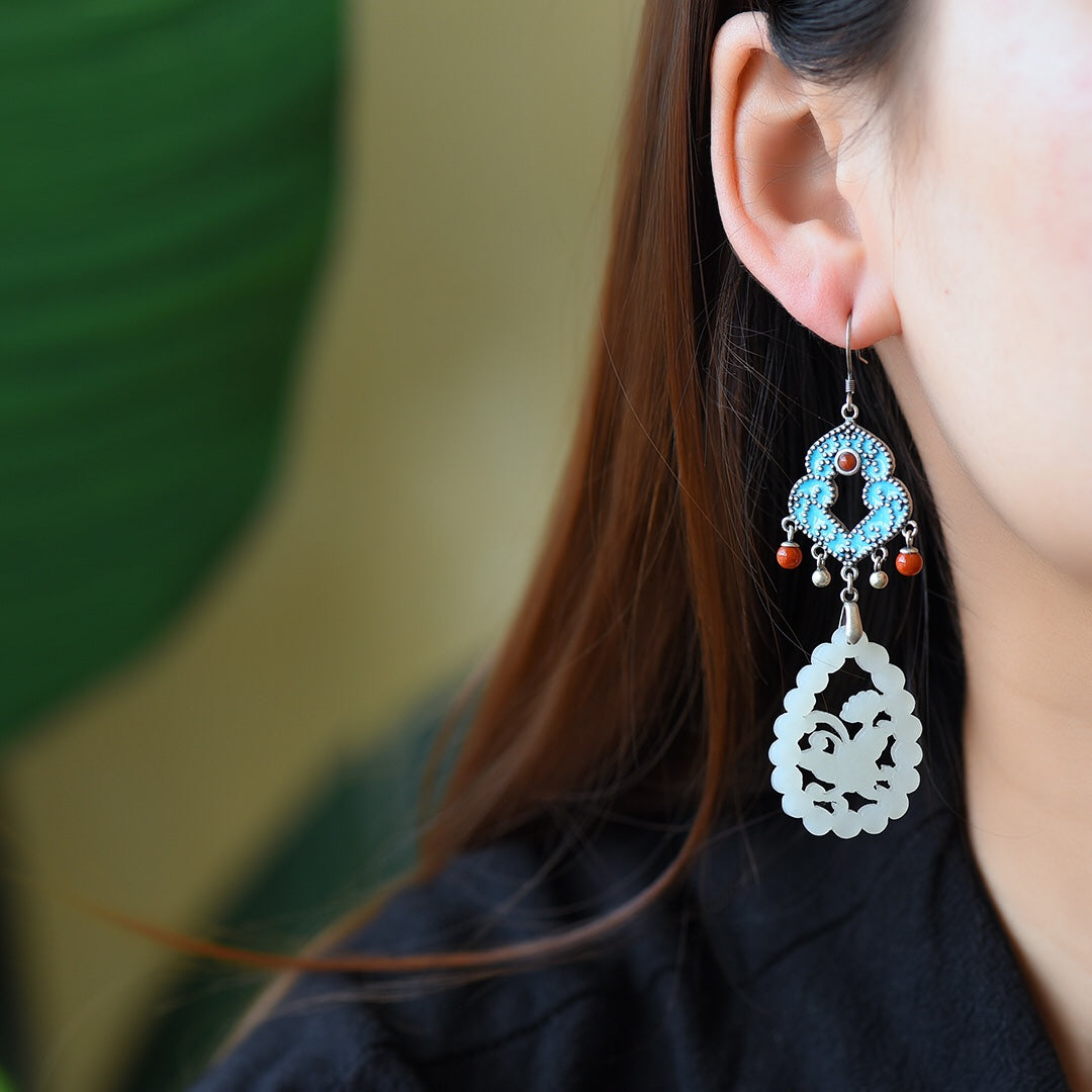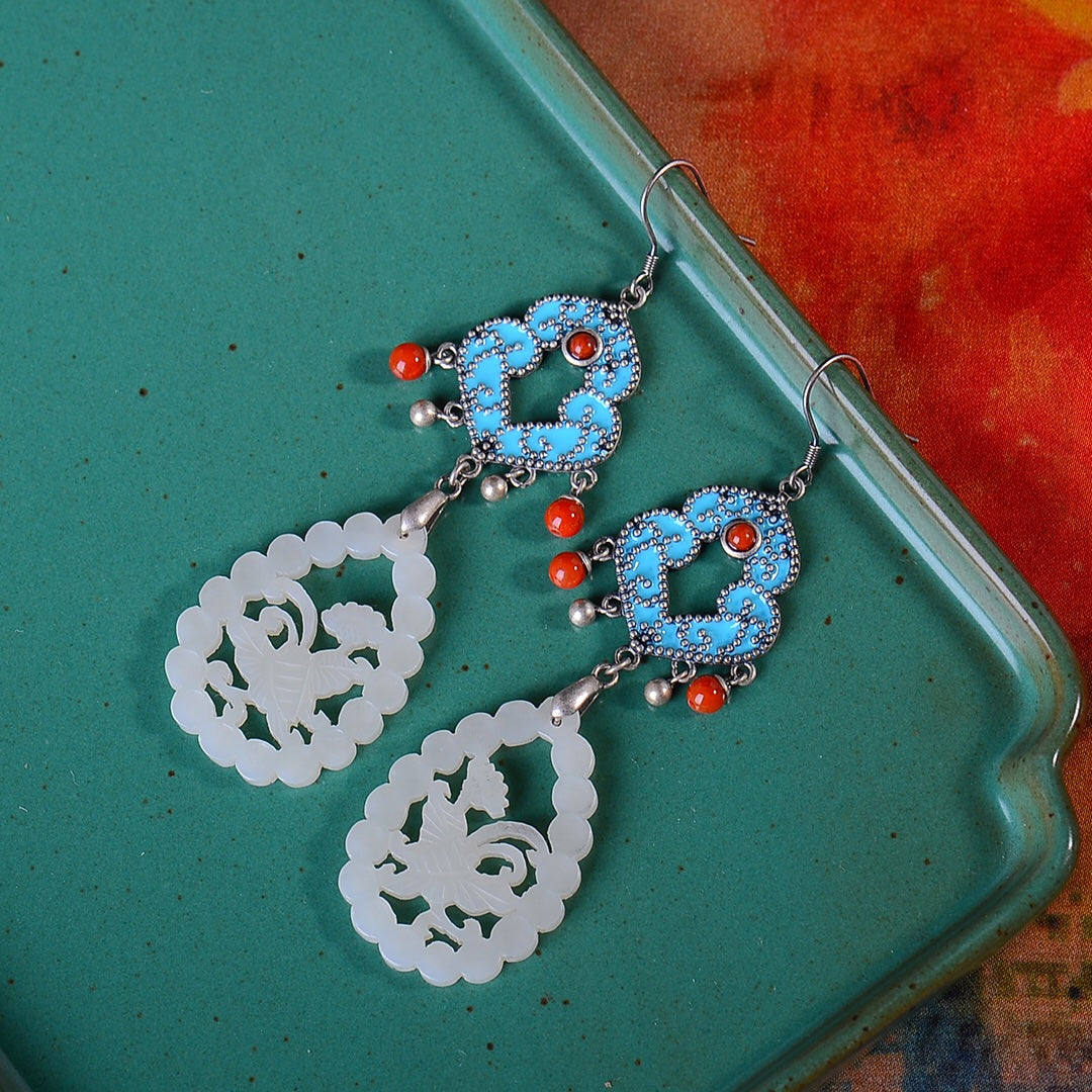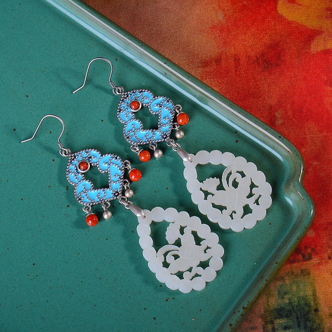 Silver inlaid Hetian jade vintage Ming hollow earrings