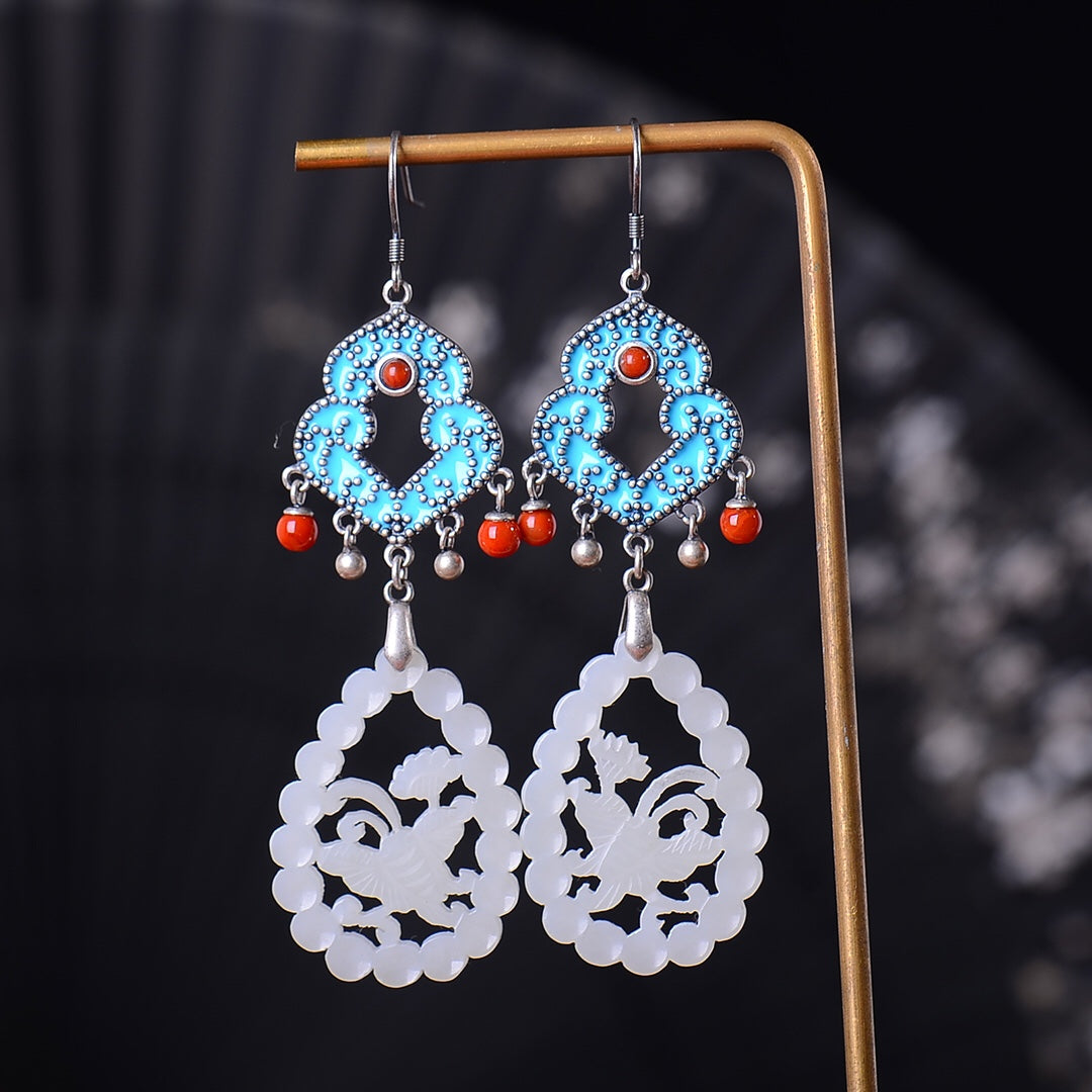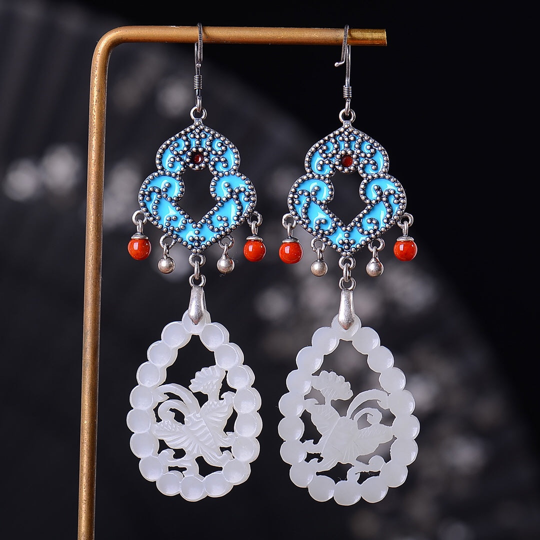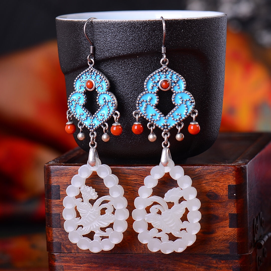 Silver inlaid Hetian jade vintage Ming hollow earrings
